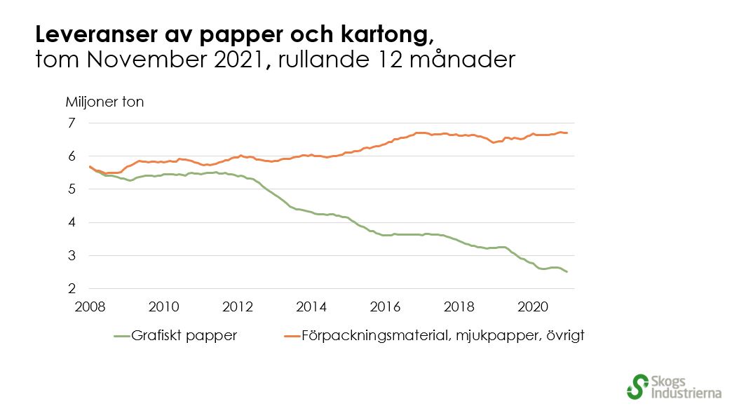 Efterfrågan på förpackningsmaterial (kartong, förpackningspapper och specialkartong) är fortsatt hög och under 2021 har produktionen legat på höga nivåer.