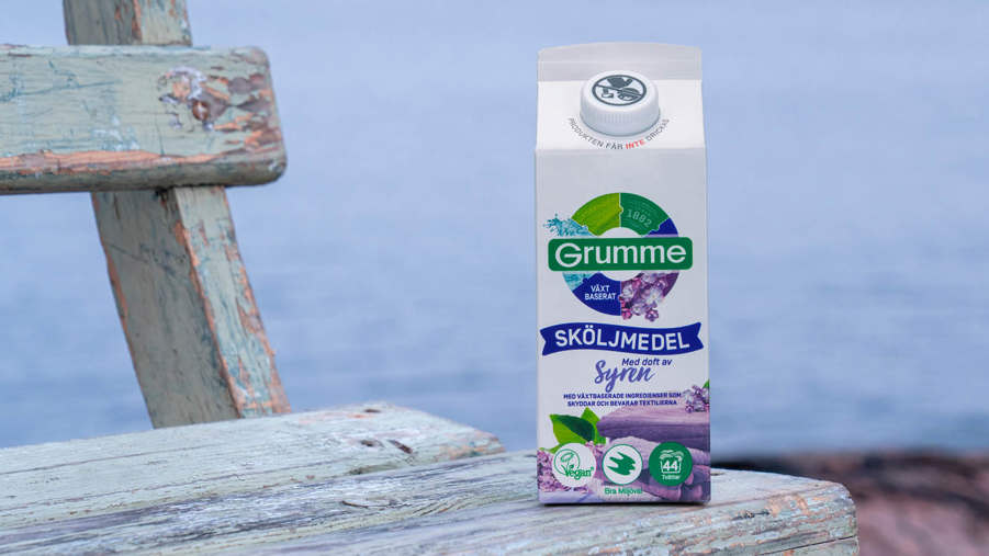 Mjuka pasteller, milda toner och lätt att stapla. Grummes nya kartong för flytande tvättmedel har samma form som ett juicepaket, och den tomma förpackningen kan läggas i återvinningen på precis samma sätt som du gör med vanliga förpackningar för mjölk eller juice.