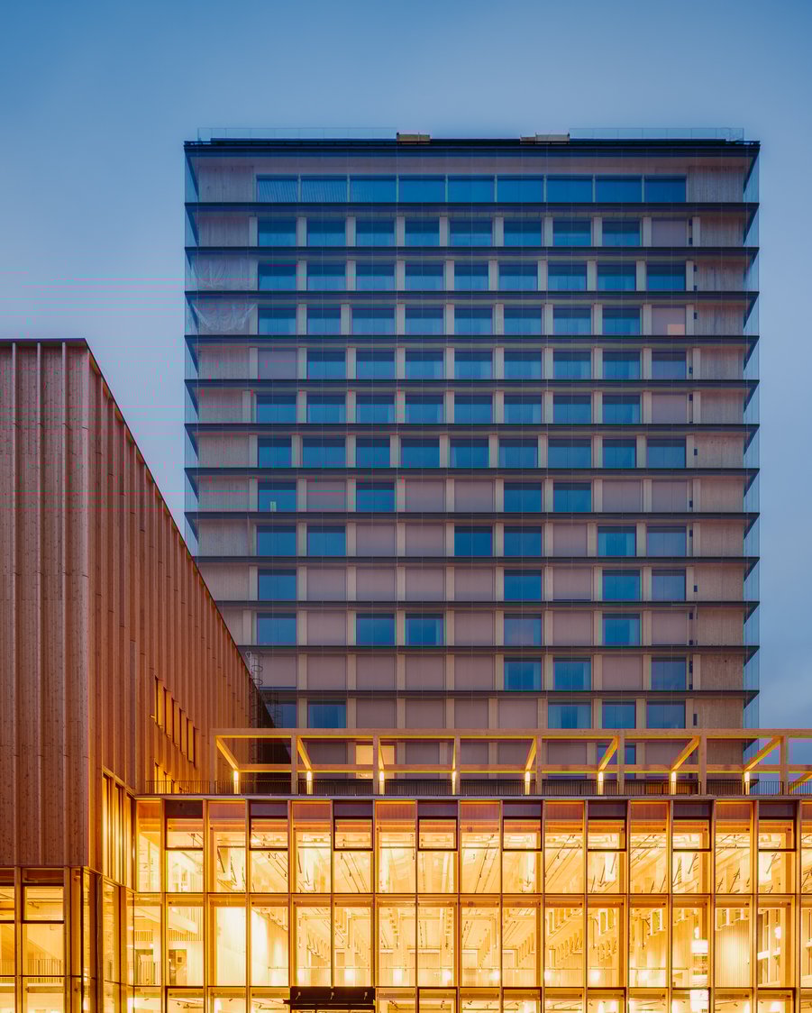 Sara kulturhus, Martinsons/Derome, invigdes i september 2021. Det flerfaldigt prisbelönta byggnaden, med sina 20 våningar, är ett av världens högst trähus. Skogsråvaran kommer från skogarna runt Skellefteå. Byggnaden rymmer sex teaterscener, stadsbibliotek, två konstgallerier, ett konferenscenter, restauranger och ett hotell. Enligt beräkningar ska kulturhuset binda cirka 9 000 ton koldioxid under sin livstid – motsvarande 13 500 personers flygresor från Stockholm till New York. Arkitekt: White Arkitekter. Byggherre: SBB i Norden. Foto: Jonas Westling.