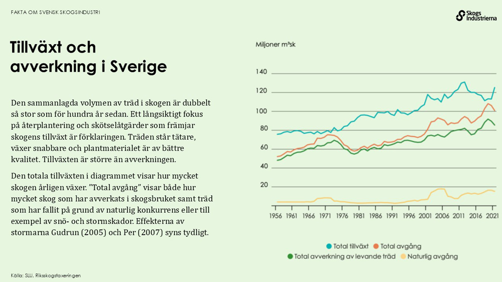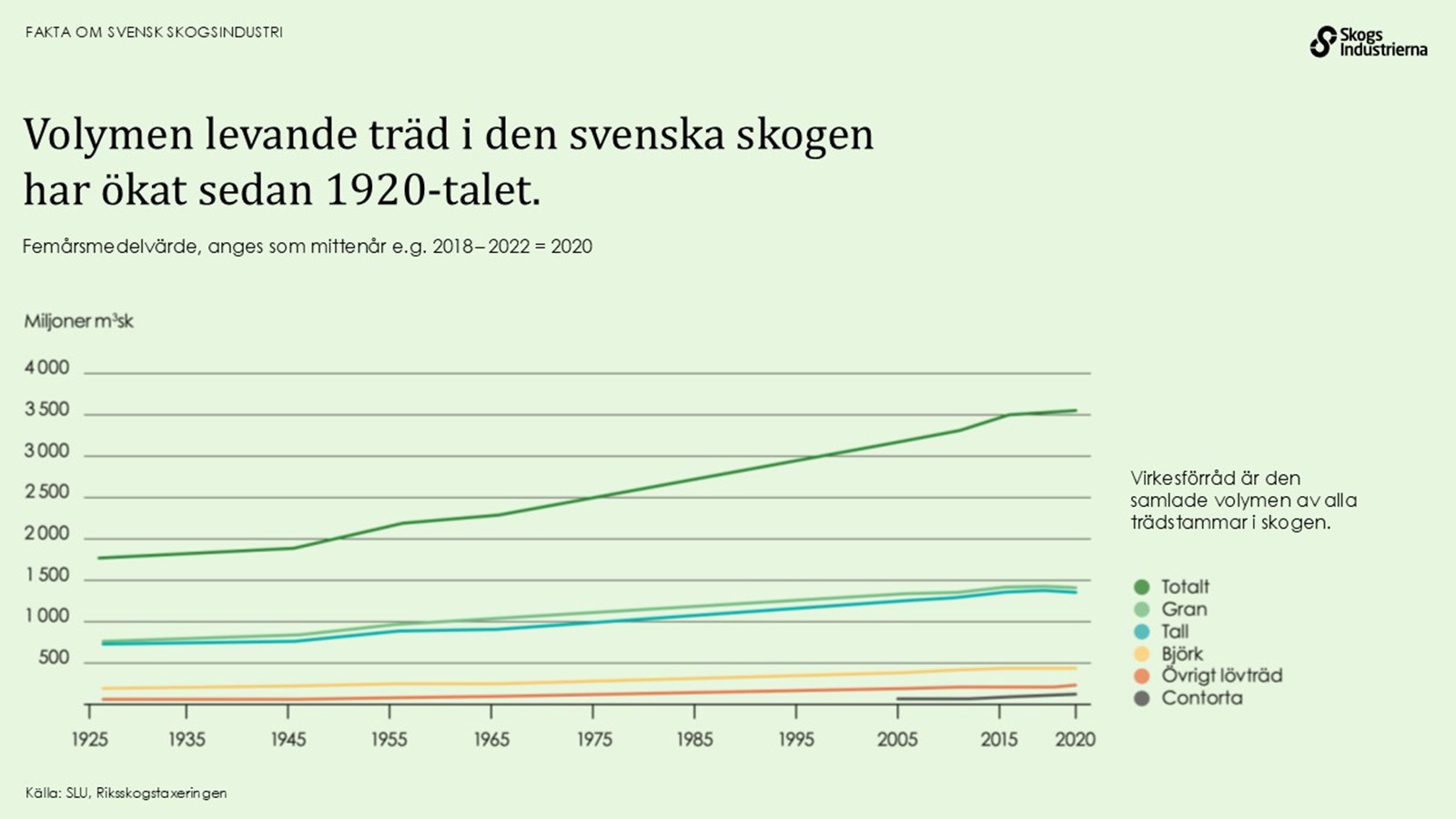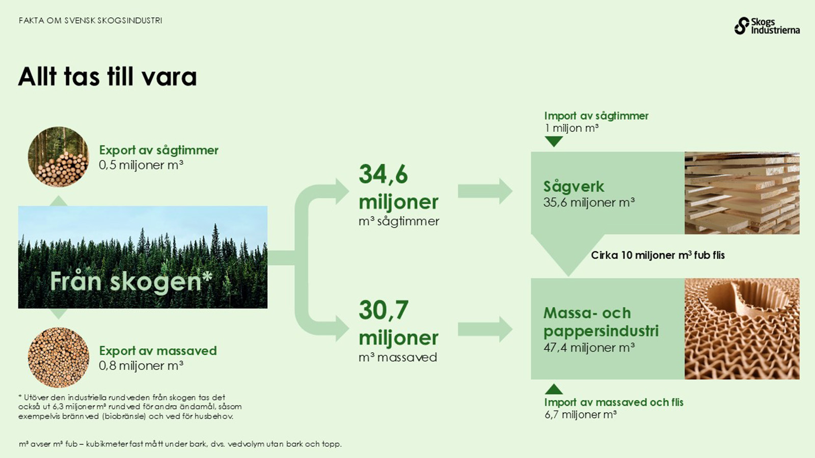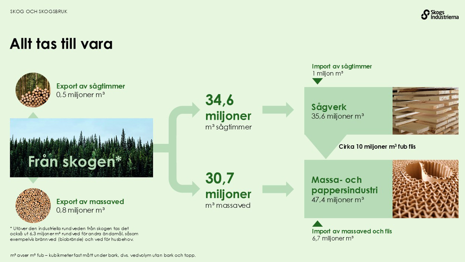 Värdet som svensk skogsindustri skapar, bygger främst på svenska skogar. Drygt 85 procent av den svenska skogsindustrins virkesförsörjning är svensk råvara. Ungefär hälften av råvaran används som sågtimmer, den andra hälften går till massa- och pappersbruk. Även sidoströmmar, som sågverksflis som blir över från sågprocessen och används i massa- och pappersbruk, har stort ekonomiskt värde.