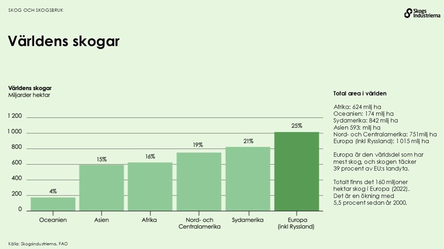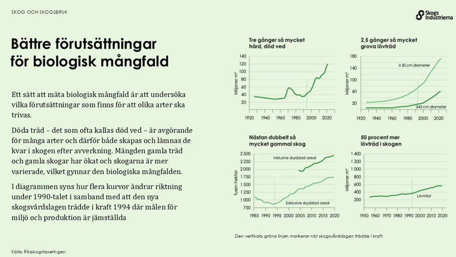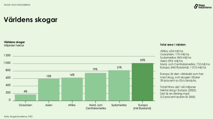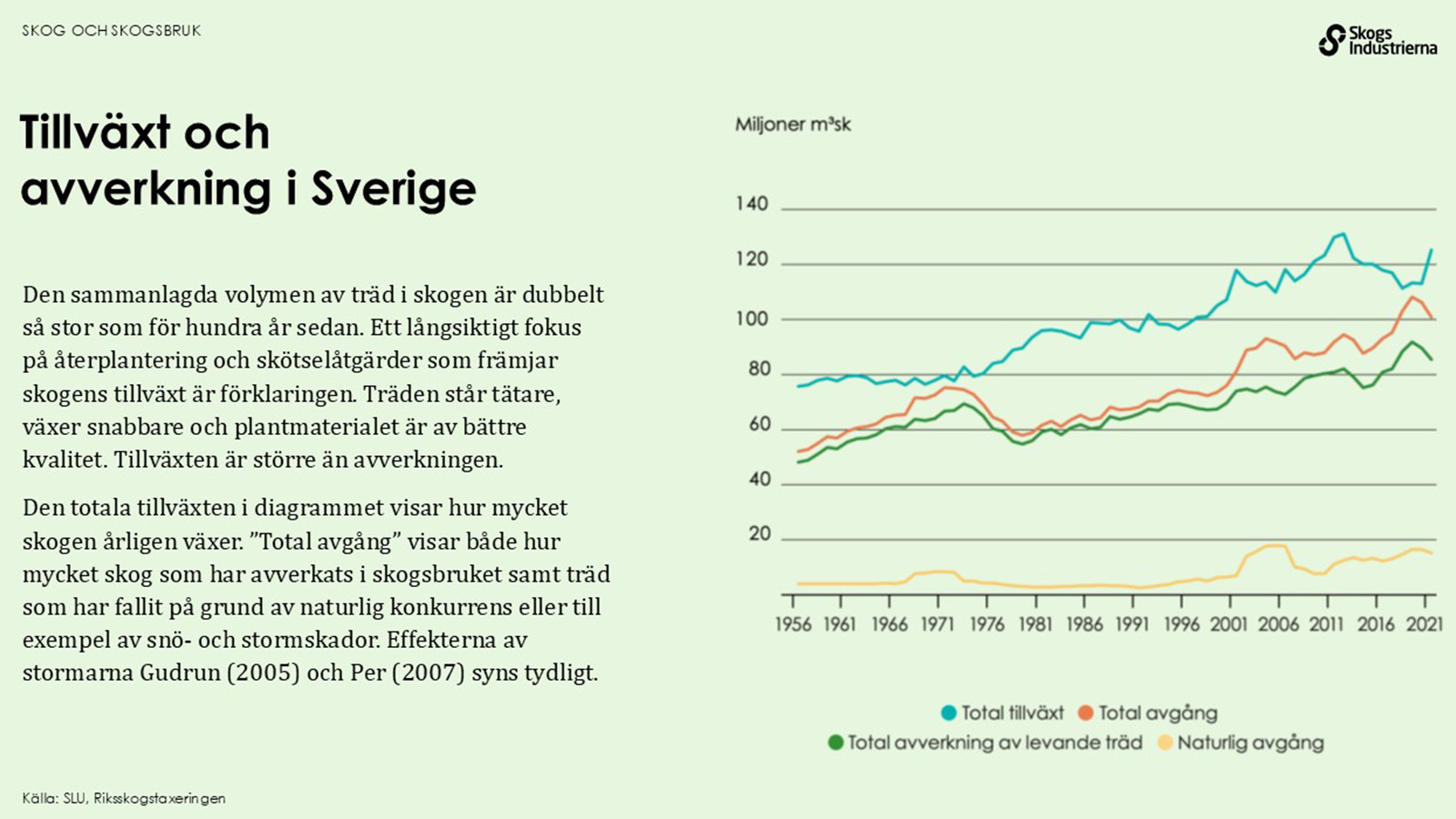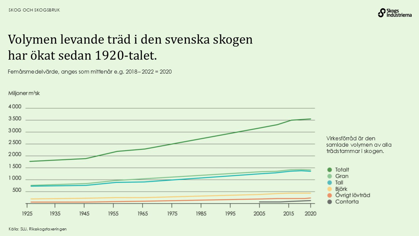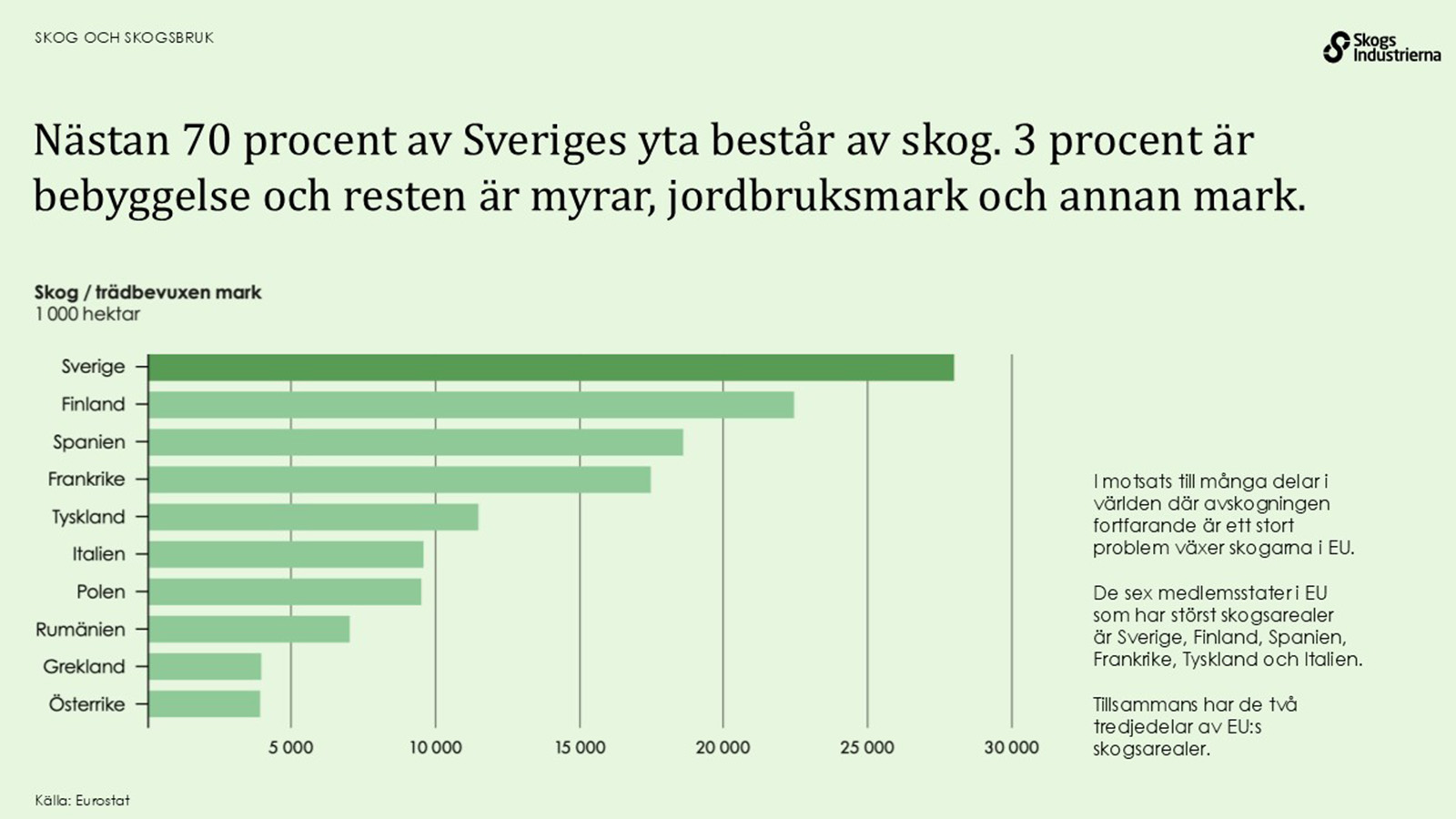 Sverige är ett land med mycket skog. Merparten av den har använts och brukats av människan i flera hundra år. Sedan tidigt 1990-tal har det svenska skogsbruket bedrivs utifrån jämställda mål för produktion och miljö. Statistiken på den här sidan visar hur viktig skogen och skogsbruket är för Sverige.